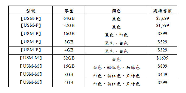 ![]() Sony新推出的Micro Vault麥克碟【USM-P】與【USM-M】將於8月中正式在台上市,建議售價請參考下表。歡迎消費者前往Sony Style Taipei 101店、Sony Style Taipei復興店或Sony Style官方購物網站【www.sonystyle.com.tw】、Sony客服中心 (電話:4499111) 或各大3C賣場洽詢選購。