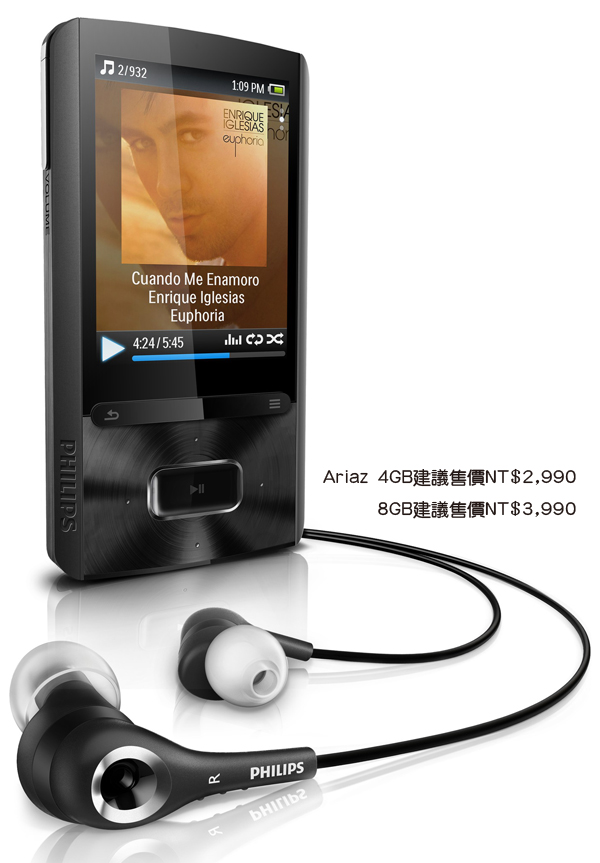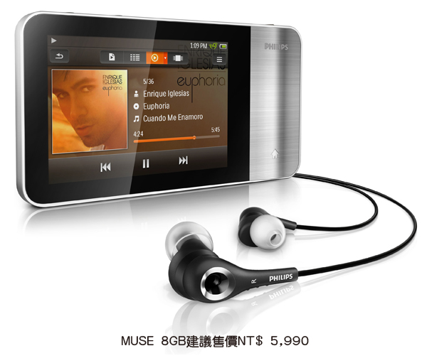 「MUSE 、Ariaz 、ViBE MP4 PLAYER」MUSE系列透過FullSound™技術與影片環繞音效,呈現絕佳音質與身歷其境的臨場感,搭配3.2 吋 HVGA 彩色顯示器,帶來前所未有的影音響宴,同時內建喇叭,隨時分享好音樂,還配備高階抗噪耳機,讓您即使在低音量時也能感受好聲音。SafeSound技術,讓您盡情享受音樂而不損害聽覺;micro SD卡插槽,可擴充至32GB,還擁有電容性觸控螢幕能讓瀏覽直觀而流暢。(MUSE 8GB建議售價NT$ 5,990)