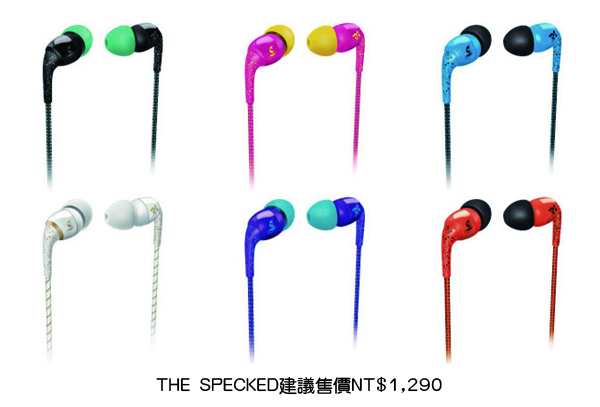 「有型有色:THE SPECKED」THE SPECKED為入耳式產品系列,共有6款型號,每款產品均搶眼奪目,最適合愛好成為眾人焦點的人士使用。THE SPECKED系列採用9mm釹磁鐵動圈單元,提供6-23,500Hz頻率響應,並附送3對不同尺寸耳塞,確保隔音效果理想之餘亦聽得舒適。THE SPECKED亦採用與其他系列相同的防糾結編織式接線,讓使用者無需再為整理耳機線而煩惱。(THE SPECKED建議售價NT$1,290)