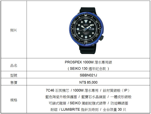全新SEIKO PROSPEX 1000 M飽和潛水專用錶「藍鯨」以SEIKO 130週年紀念錶款的身份隆重上市。SEIKO PROSPEX 潛水錶自1975年即開發有一體成形的錶殼與獨家專利L型墊圈,實現世界之最的氣密、水密等級,並以獨領風騷的免排氦特色,站穩SEIKO在專業運動錶款的領導龍頭地位。本次發表的PROSPEX 1000 M飽和潛水專用錶,是以充滿海洋氣息的藍色陶瓷保護圈象徵著徜徉在大海中的「藍鯨」,以王者之姿稱霸海洋。高亮度的Lumibrite夜光塗料以及獨家專利蛇腹式錶帶,以深海工程潛水所需為設計目標,打造深得專業人士信賴的時尚潛水錶款,全球限量400只,台灣限量30只,每只皆有限量背刻序號,是結合時尚及專業的典藏首選。