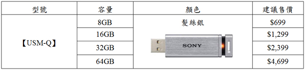 ![]() 全新Micro Vault【USM-Q】將於11月正式上市。歡迎消費者前往Sony台北(101)直營店、Sony台北(復興)直營店、Sony台中直營店、Sony高雄直營店、Sony官方購物網站【www.sony.com.tw/store/】、Sony客服中心(電話:4499111)以及各大消費性電子產品通路選購。