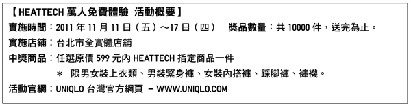 萬人活廣告 寫下你的HEATTECH保暖宣言你的體驗心得,將有機會成為活廣告。UNIQLO誠摯邀請幸運的中獎消費者,把自身體驗HEATTECH的心得感想,至活動網站上留言,除心得感想將與FACEBOOK連動外,UNIQLO還會徵選數名心得感想,製作成平面廣告公開,讓你的冬日保暖心情有機會和大家分享。