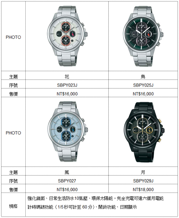 「花、鳥、風、月」勾勒日本綺麗風光![]() ▲左上: 花SBPY023J / 右上:風SBPY027J / 左下: 鳥SBPY025J / 右下:月SBPY029JSEIKO Spirit Smart「花、鳥、風、月」特別企劃款,是以象徵日本大自然風貌的「花鳥風月」為命題,將別具意境的綺麗景致,透過日本細膩的工藝手法做出詩意的呈現。象徵櫻花盛開景象的「花」,以全白的面盤搭配鮮豔的小秒針,詮釋櫻花紛飛時的美麗雅緻的景象;詮釋雀鳥飛翔的「鳥」,則以墨綠色的面盤打造雀鳥羽毛的閃耀光澤,低調沉穩的色彩,演繹出雀鳥優雅及尊貴;代表著初夏微風的「風」,以白色為底,藍色線條點綴,搭配上細緻的底紋,彷彿是夏天的微風吹過水面的波紋,帶來一股清新的涼意;而象徵皎潔明月的「月」,則以漆黑的電鍍不鏽鋼錶身搭配全黑的錶盤,四環以金色紋路做裝飾,彷彿一輪高掛於夜空中的明月般,皎潔明亮,充滿典雅風味。