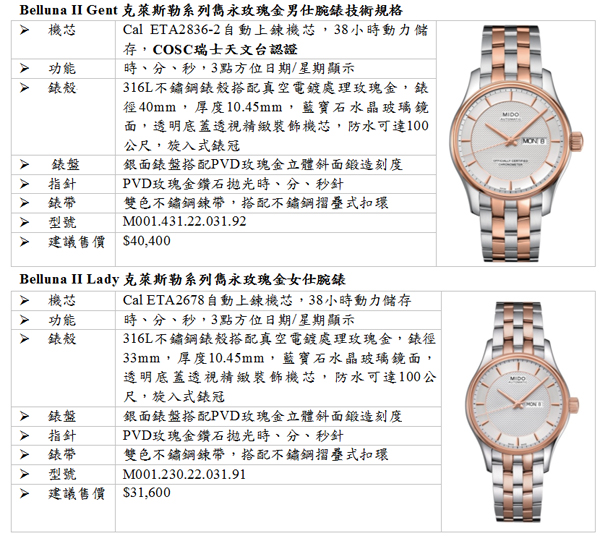 ![]() ▲克萊斯勒系列雋永女仕腕錶MIDO美度表品牌副總藍楷茗表示,迎接101年,除慶賀過去的成就與辛勞外,亦為贈禮饋謝與犒賞自我的美好時刻,龍年象徵著吉祥與尊貴的喜氣,MIDO美度表特別推出全新設計Belluna克萊斯勒系列雋永玫瑰金腕錶,為原先冷冽鋼鐵線條感濃厚的克萊斯勒系列,增添更豐富的錶盤變化與立體感,細緻的三角紋刻印、層次躍然的立體錶盤,為系列錶款注入全新魅力元素。擁有天文台認證的男仕腕錶搭配上尊貴的雙金鍊帶,讓消費者透過內外兼具的禮讚,除可向尊敬的對象餽贈心意外,亦展現個人品味和地位,在新的一年邁步躍升。