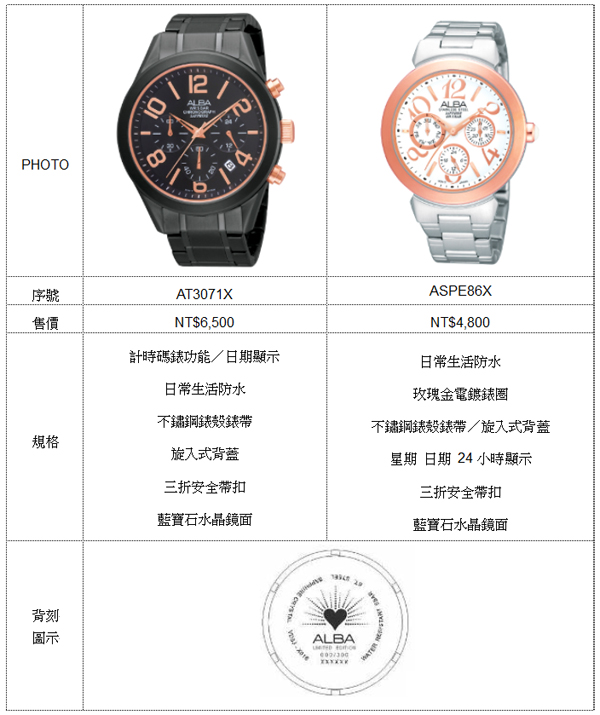 彭于晏推薦ALBA 情人節限定錶款 Sweet Moment浪漫加碼送充滿陽光活力的時尚腕錶品牌ALBA,由代言人彭于晏在隆冬為情人們獻上暖呼呼的愛戀祝福,ALBA西洋情人節台灣獨賣限量對錶以散發光芒的愛心圖案為背刻,搭配限量序號,為情侶驅趕冬天的寒意,帶來暖暖愛的浪漫情懷。男錶以流線造型的黑色電鍍不鏽鋼錶帶打造出具運動感的都會時尚,玫瑰金的計時按把與面盤時標讓帥氣增添沉穩與內歛,全台限量500只;女錶錶盤採用了女孩們最喜愛的純淨白色,同樣搭配著玫瑰金時標,數字時標位置與男錶相互呼應,皆於偶數時間以數字呈現,花體數字造型彷彿日漸甜蜜的愛戀情愫,柔美而時尚,全台限量300只。