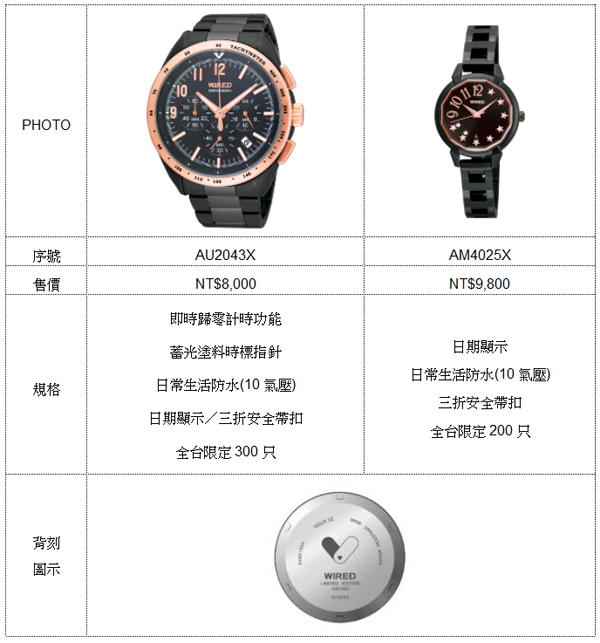 WIRED限量背刻 分秒相隨 紀念愛戀時刻引領日本街頭潮流的腕錶品牌WIRED 2012年西洋情人節也不缺席,推出擁有專屬背刻的台灣限定情人節錶款,以酷炫的黑色電鍍與玫瑰金做搭配,錶盤置入金屬與搖滾的不規則元素,混搭出專屬於情人節的浪漫樂章。男錶以大面積的玫瑰金錶圈以及古典時標打造出復古時尚,全台限定300只;女錶設計有獨特的立體切割錶殼,展現既率性又甜美的女人味, 鉚釘造型的玫瑰金星狀時標座落在1到8點的時刻位置,呼應男錶面盤同樣位置的立體時標,彷彿兩者心心相映,既各具特色又擁有共同的一份情感,全台限定200只。兩款錶款皆附限量序號以及以時間指針概念設計的弧線造形愛心背刻,讓個性化的兩個人內心還是無時無刻相連相繫。 1月20日至2月14日起只要購買任一只WIRED情人節限定錶款,還能獲贈Emily 比利時紅甜心巧克力乙盒(數量有限,送完為止),為完美與浪漫披上甜美的糖衣!