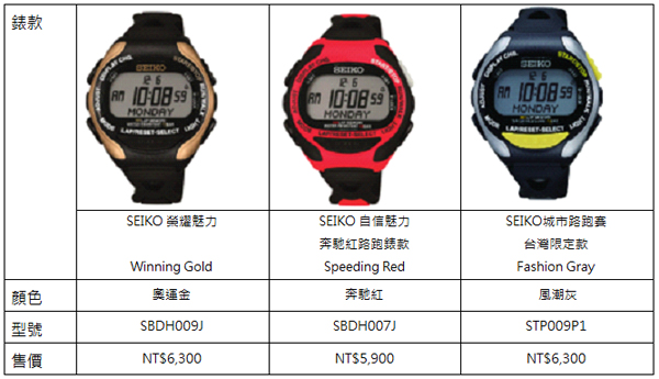 ![]() ▲SEIKO PROSPEX Super Runner 擁有時尚流線外型 共有奧運金、奔馳紅、風潮灰三款動感色彩「SEIKO Super Runners城市路跑賽」邁入第二屆,台灣精工鼓勵全民享受跑步時光!跑步不僅是空間上的里程數,而無論距離長短,開始將時間安排來跑步,投入跑步、享受自我,就是最精采的時刻!因此,台灣精工亦為這次比賽準備多樣錶款作為競賽獎項,鼓勵大家享受自我跑步時光,競賽組第一至第三十名皆可獲得精美好禮!競賽男子組第一名可獲得價值NT$18,000元之SEIKO Sportura三眼鬧鈴運動計時碼錶,第二名可獲得SEIKO Criteria 運動計時碼錶(市價NT$14,800),第三名可獲得SEIKO CS環保太陽能計時碼錶(市價NT$9,500元)。競賽女子組第一名獎項為SEIKO Lukia仕女腕錶(市價NT$17,500元),第二名獎項為SEIKO Criteria仕女腕錶(市價NT$12,500元),第三名獎項為SEIKO Vivace仕女腕錶(市價NT$ 9,500元)。競賽男子組與女子組之第一至第十名皆可獲得Super Runners 路跑系列錶款中市價NT$6,300之錶款!現場再安排抽獎大禮!首獎為「東京馬拉松體驗之旅」一名(含門票、機票與住宿兩泊一宿),貳獎為最新發表之SEIKO PREMIER人動萬年曆腕錶一名(市價NT$28,000元),參獎為SEIKO Super Runners 路跑系列錶款「台灣限定款」一名!