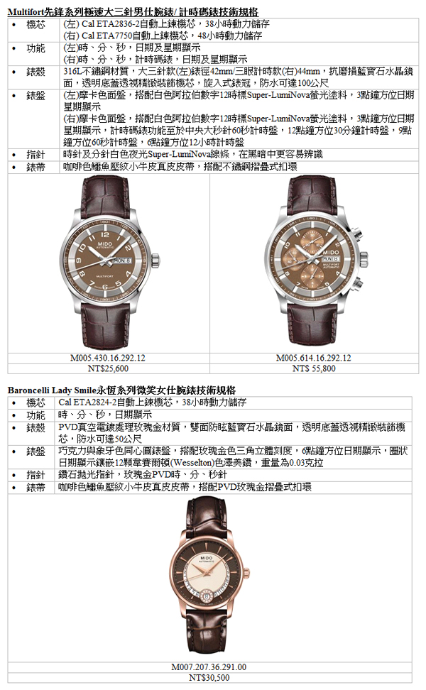 ![]() ▲先鋒系列騎士腕錶_三眼計時MIDO美度表品牌副總藍楷茗表示:「機械錶款多以黑、白、銀為主流色系,MIDO美度表近年錶款推陳出新,擺脫保守基礎色調,提供消費者更豐富的面盤設計與顏色選擇,2012年秋冬,各系列推出多款咖啡色系錶款,為腕錶選擇增色不少。男錶部分推薦全新摩卡色的Multifort先鋒系列極速男仕腕錶;女錶部分,日前推出擁有濃醇巧克力色的Baroncelli Lady Smile永恆系列微笑女仕腕錶也獲得相當的市場好評與詢問度。美度表鼓勵消費者透過小細節的重點配件改變整體造型的聚焦視點,擁有一只精準的風格機械腕錶,無論是功能性與造型性都很高,適合秋冬季節穿搭。」