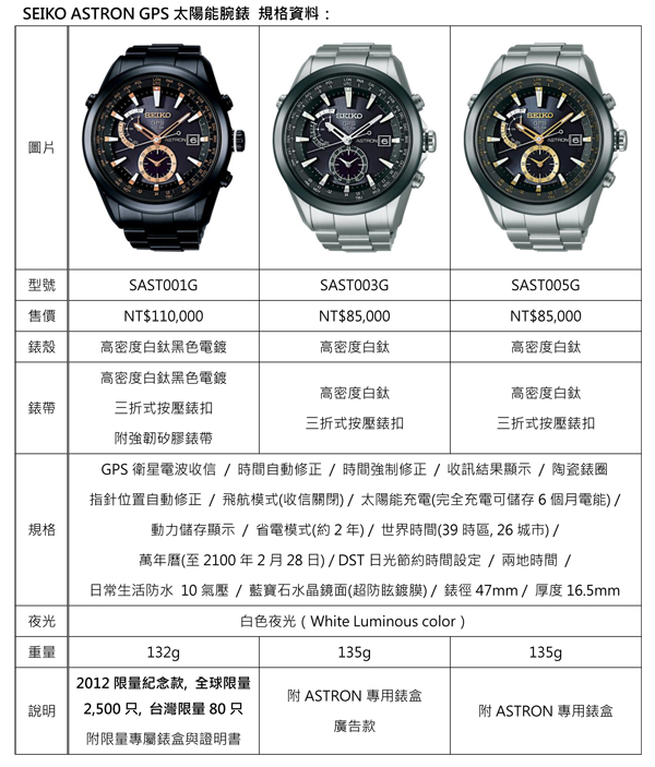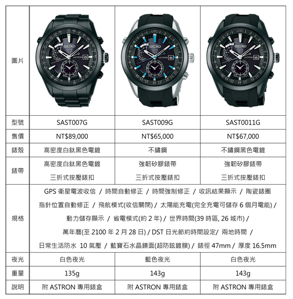 ![]() ▲全新SEIKO ASTRON : SAST003G / NT$85,000SEIKO ASTRON GPS太陽能腕錶,全系列六款腕錶將於九月下旬全球同步上市。ASTRON高密度白鈦款SAST003G、SAST005G,建議售價為NT$85,000;黑色電鍍錶款SAST007G,建議售價為NT$89,000;ASTRON不鏽鋼錶款SAST009G與SAST011G,建議售價分別為NT$65,000與NT$67,000。同步發行為慶祝全球上市活動所特別打造的ASTRON 2012年限量紀念款SAST001G,建議售價為NT$110,000,全球限量2,500只,台灣限量80只。