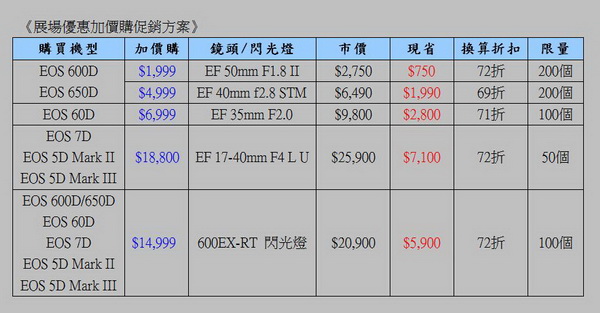 ![]() 為慶祝EF系列鏡頭生產突破8000萬支,Canon再推出EOS 5D Mark III撘配EF 24-70mm II的超值套組,除了單機身和EF 24-70mm F/2.8L II USM之外,再加碼CF 32GB(400X)記憶卡兩張、原廠電池LP-E6和百微鏡頭杯,原價NT$189,000元,現場購買NT$179,000,現省一萬元!此外,上周推出的大光圈高效能類單眼PowerShot G15全新售價為NT$15,990元。而類單眼旗艦機種PowerShot G1X也同時全面降價NT$2,000元,現購NT$21,990元再送16G SD記憶卡。