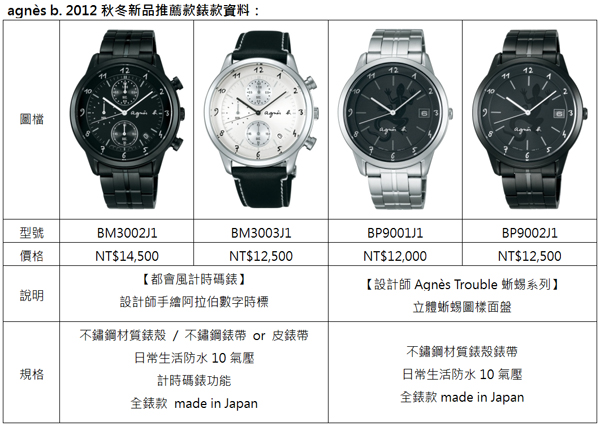 ![]() ▲錶款型號 (左至右) BM3002J1 / BP9001J1 / BM3003J1agnès b. 2012 秋冬推薦錶款「都會風計時碼錶系列」BM3002J1與BM3003J1,以輕薄中性的錶盤設計,搭配設計師Agnès Trouble的手繪阿拉伯數字時標,饒富隨興趣味,建議售價分別為NT$14,500及NT$12,500;「Agnès Trouble蜥蜴系列」BP9001J1與BP9002J1,將agnès b.品牌logo蜥蜴圖樣刻畫於錶面,經典且活潑鮮明。建議售價分別為NT$12,000及NT$12,500,巧妙打造都會雅痞人士的時尚風範。