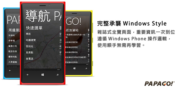 ![]() “導航PAPAGO!”完全符合微軟對最佳使用者體驗所制定的規範;一進入軟體,就可以馬上感受煥然一新的PAPAGO!,重要資訊一覽無遺,在彈指之間就設定好目的地,立刻出發;在軟體效能上,因為掌握WP8開發技術,畫面轉換及操作反應流暢快速,不論市售高階的WP8手機HTC 8X 及 Nokia Lumia 920 或是目前較低階的HTC 8S, Nokia Lumia 820,PAPAGO!在上面運行的效能都十分良好。此外,在介面設計上也秉承簡潔明快的風格,整體畫面實用而不花俏,細膩展現WP8的魅力。