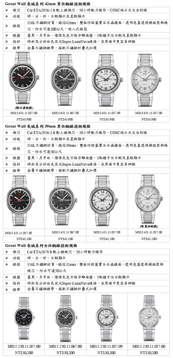 ![]() ▲2013年MIDO美度表推出全新Great Wall長城系列加入錶款陣容,成為MIDO美度表實現「靈感印證永恆A mark of true design」設計精神的最新里程碑。戲劇小天后陳意涵(中)出席發表會,會中與MIDO美度表品牌副總藍楷茗(左)、Sw全新Great Wall長城系列腕錶面盤上細密浮雕般的方格,厚實的錶盤側面以細緻的溝槽刻紋,搭配亮霧交錯的特色鍊帶,堅固如守護國家長城關隘上的石雕磚刻,厚重而堅毅,標識性的彰顯Great Wall長城系列的恢宏氣度。兩千年時光中長城的流轉與變化融匯於三種尺寸的錶盤中,42mm、39mm與31mm三種不同錶徑與顏色面盤提供選擇,整體配色以黑灰白基礎色調呼應建築風格,其中,擁有42mm與39mm錶款更擁有高準度瑞士天文台認證,而當中面盤最袖珍的31mm錶款則延續同款面盤設計,在各類場合彰顯中國元素多樣的魅力。