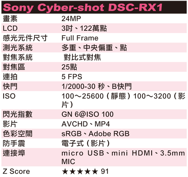 全片幅感光元件畫質出色![]() 35mm 全片幅 CMOS 感光元件RX1 最吸引玩家之處在於使用與自家全片幅 DSLR 旗艦的 A99 同樣的感光元件,全片幅 CMOS 的尺寸為 36 × 24mm究竟有多大,一般消費型隨身機的尺寸為1/2.5吋,也就是約5.38 × 4.39mm,全片幅面積足足為其34倍大。這樣大的面積可讓感光元件減少熱噪的影響,因此畫質會好上非常多,也因為如此,在高 ISO 表現會好上數倍,而高 ISO 派上用場時就是在低光源的情境,翻成白話來說,RX1 的夜拍能力在同尺寸的相機裡,可說是無人能敵。RX1 可以支援到 ISO 25600,而且 ISO 20000 時的畫質仍是可用,可說非常驚人。![]() ▲35mm 全片幅的感光元件,畫質好且能支援更高 ISO。