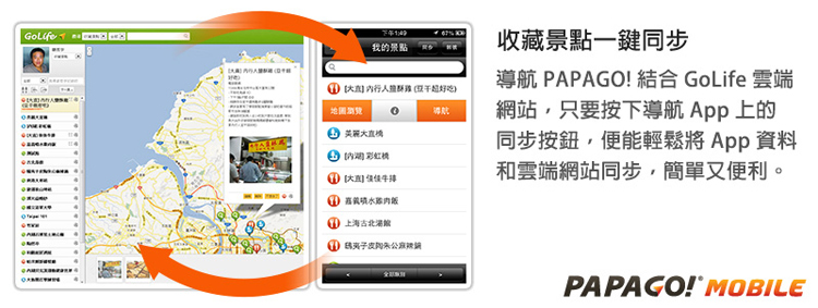 ![]() 「導航PAPAGO!」除了讓用戶將收藏景點儲存回雲端,更進一步整合GoLife旅遊記錄網站,用戶可以透過網頁管理自己的收藏,並透過GoLife跟朋友分享私房景點;也可以在GoLife瀏覽及收藏其他用戶或PAPAGO!推薦的熱門景點,並直接將這些遊玩的資訊同步到App,立刻導航,再也不用為了找私房或新興景點,陷入迷途;「導航PAPAGO!」也會利用地圖及語音提示您附近的收藏地點,為您的旅途帶來意外的驚喜。