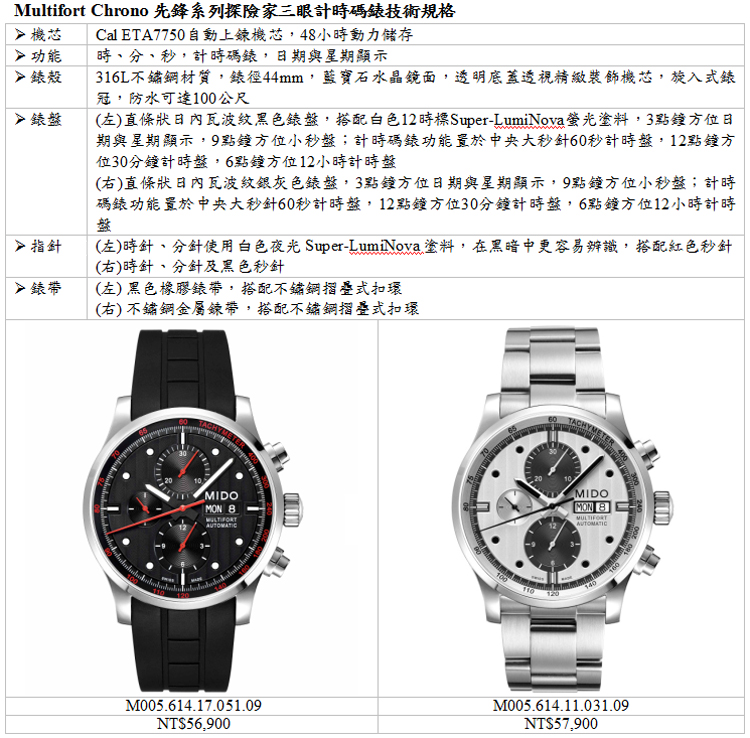 時間的禮物 白色情人節贈錶推薦 先鋒系列探險家三眼計時碼錶![]() ▲先鋒系列探險家三眼計時碼錶_橡膠錶帶●動感黑紅色調:獻給陽剛時尚的動感男仕 Multifort Chrono先鋒系列探險家三眼計時碼錶搭配黑色橡膠錶帶,以動感黑紅色調為主題,44mm超大日內瓦波紋黑色錶盤成為視線焦點,隨著日內瓦波紋微妙變化的黑色面盤,展現細膩層次,搭配上雙色絕對比例計時盤,錶圈細小紅色時刻與同色系秒針,讓這只腕錶擁有獨樹一格的魅力,藍寶石水晶鏡面下的錶盤和側面的錶耳線條,增添獨特完美性。白色12時標使用Super-LumiNova螢光塗料,黑暗中也能輕鬆閱讀時刻,輕盈耐用的黑色橡膠錶帶與細緻的錶盤質感,同時兼顧運動感的時計追求與優雅基調,成為不可錯過的年度單品,打造出格調不凡的男人品味,最適合熱愛擁抱陽光的動感男仕,建議售價 NT$56,900。 ![]() ▲先鋒系列探險家三眼計時碼錶_金屬鍊帶
