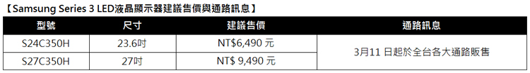 三星電子發表全新Samsung SC350H顯示器,讓消費者能以無負擔預算享有簡約薄型美學工藝設計,並體驗超高畫質影像以及直覺簡易操作功能。全新SC350H顯示器搭載百萬動態對比(Mega DCR)技術,提供絕佳的對比度和動態圖像效果,彷彿每個影像環節都真實地刻畫在眼前。同時採用Magic Upscale,即使是低解晰來源的圖像,也能展現絕佳的影像品質。此外Samsung SC350H更獲得Windows 認證,可完美兼容Windows 8,並具有Eco Saving功能讓消費者在享有高品質影像的同時,還可輕鬆控管能源、輕鬆節能。Samsung SC350H顯示器將在3月11 日於全台各大通路販售,23.6吋建議售價NT$6,490元,27吋建議售價NT$9,490元。