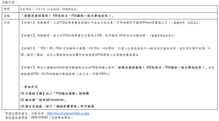 ![]() 近年來國內虐童殺童案件層出不窮,孩子的幸福理當受到保障,然而卻因大人複雜的世界,讓孩子們承擔不可承受之重,除了體膚的疼痛外,更犧牲了無辜的性命,有鑑於此,PQI積極響應家扶基金會「用愛包圍受虐兒」的全面性宣導活動,為有效宣導大眾對於兒童保護的重視,在PQI Store實體通路以及PQI Facebook舉辦「保護兒童就靠你! 428兒保日,PQI邀你一起大聲喊出來!」活動,希望透過社區網絡的倡導,連結社會大眾的力量,有效杜絕對兒童造成威脅的成長環境,喚起你我對於受虐兒的重視,讓每個孩童能在充滿愛的環境中健康成長。