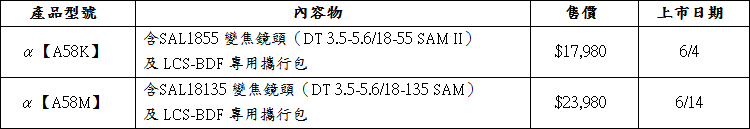 全新α【A58】數位單眼相機上市日期與建議售價等資訊請參考下表,6月4日起至7月7日凡購買A58任一系列送NP-FM500H原廠電池。歡迎消費者洽詢全省 Sony 直營通路,Sony 台北(101)直營店、Sony台北(復興)直營店、Sony 台中直營店、Sony 高雄直營店、Sony 官方購物網站【www.sony.com.tw/store/】、Sony客服中心(電話:4499111)以及各大消費性電子產品通路選購。
