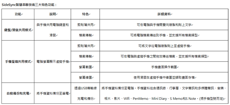 SideSync技術跨界串連 筆電手機同工 效率加倍![]() ▲Samsung ATIV Book 9 率先搭載SideSync跨界技術 智慧串聯筆電、手機Samsung ATIV Book搭載SideSync創新科技,針對Jelly Bean以上Android作業系統的Samsung GALAXY系列智慧型手機,即可以一線串聯筆電和行動裝置,展開跨界無縫新體驗。全新SideSync 技術具備三大串聯優勢,第一,鍵盤/滑鼠共用模式(Keyboard/Mouse Sharing),透過鍵盤和滑鼠即可操控手機,支援中英文打字輸入,並可複製文字在裝置間輕鬆轉移;第二,手機螢幕共用模式(Phone Screen Sharing),可在電腦螢幕上顯示出虛擬手機畫面,除了同樣支援文字複製之外,還可將檔案在筆電與手機間雙向自由存取與複製,更可使用滑鼠輕鬆在手機上繪圖,並可在電腦上截圖手機操作畫面;第三,自動備份和充電(Auto backup & charging),SideSync也支援自動備份手機檔案功能,確保資料安全,而連線同時手機同步充電的貼心設計,更提升使用便利性。