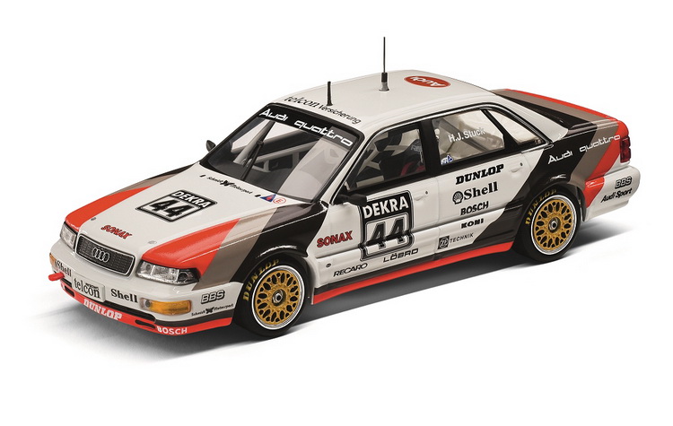 2012年利曼賽車冠軍車隊組(R8/R18 e-tron/R8 ultra),全球限量999組。每一組的編號在模型車盒子基座用不鏽鋼的材質做標記;盒子印有賽車實況的照片,也讓盒子本身變成粉絲們賞心悅目的裝飾品之一,限量15組。 2.Audi V8 DTM 1990, 1:43模型車, H.-J.Stuck Edition 製造廠商:Minichamps 建議售價:NT$ 3,914 優惠價:NT$ 3,500