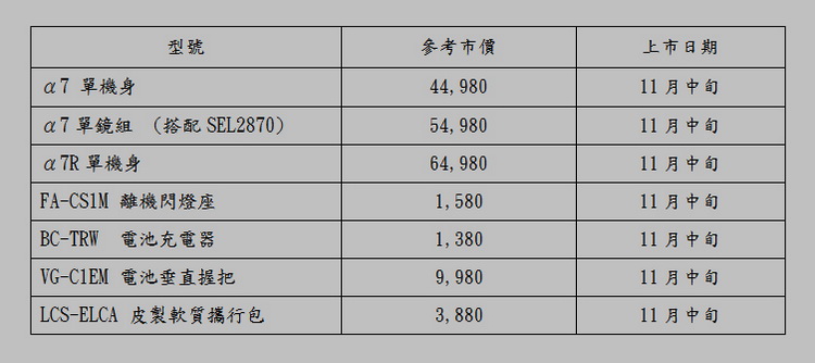 Sony α7 和α7R 全片幅可交換鏡頭式數位相機及周邊配件上市日期及參考售價