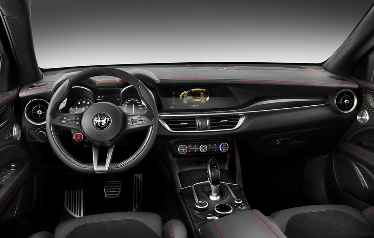 ![]() Stelvio是以與Giulia相同的底盤平台為基礎所開發,所以從外觀上來看,不論是頭燈或車頭水箱罩都與Giulia有著高度的相似度。屬於中小型性能SUV的Stelvio有著車長:468cm、車寬:216cm、車高:165cm尺碼緊湊而動感的車身比例,從車側可看出A柱有著很大的傾斜角度,讓整個車窗輪廓接近轎跑車而非一般SUV。車展上所展出的Quadrifoglio車型還配備有著碳纖飾板的車身同色側裙。