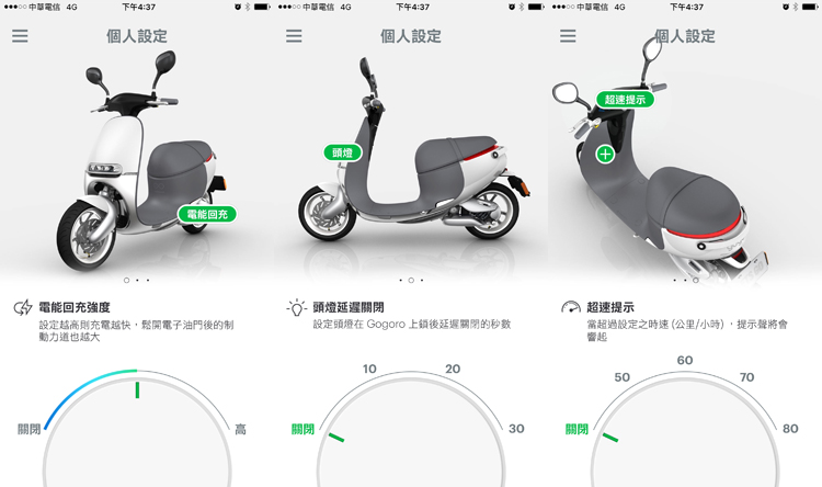 ![]() ▲Gogoro Lite 取消車廂燈與USB充電孔。除了硬體的配置上有些差異外,Gogoro Lite的韌體系統也有微幅的調整,雖然同樣具有iQ System™以及手機APP連線的功能,不過在個人化設定的部分只保留電能回充強度、頭燈延遲關閉以及超速與低速提示等功選項,其個人化選項項皆全數取消。 ![]() ▲手機APP僅剩三樣調整功能。