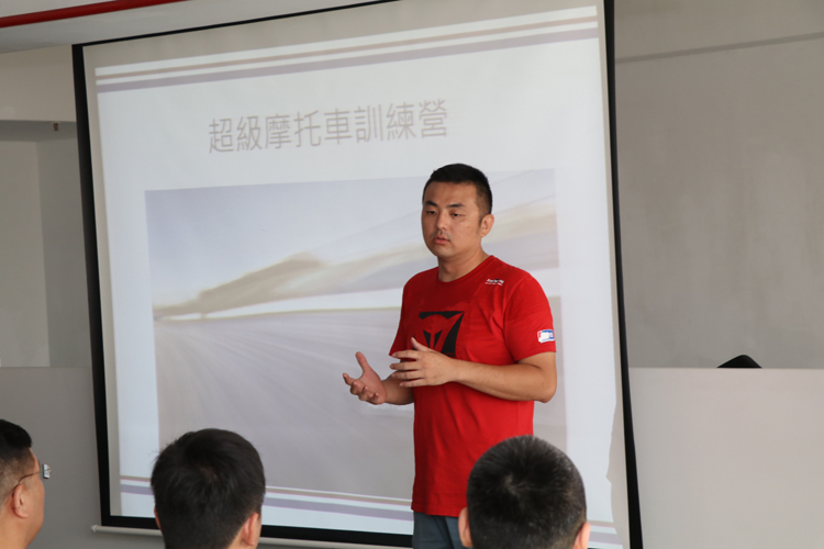 上午課程:室內教學與賽道分解練習首先室內課程由恒典摩托訓練學院總教練加菲貓為大家介紹實力堅強的教練團,教練團裡包含了多位TSF台灣大賽車車手以及資深媒體總編,加菲貓本人也在今年參賽獲得相當好的成績,而在訪問教練們的同時,大家都非常謙虛的說明,騎車只是自己的興趣,最大的熱情還是如何教學帶給學員進步。