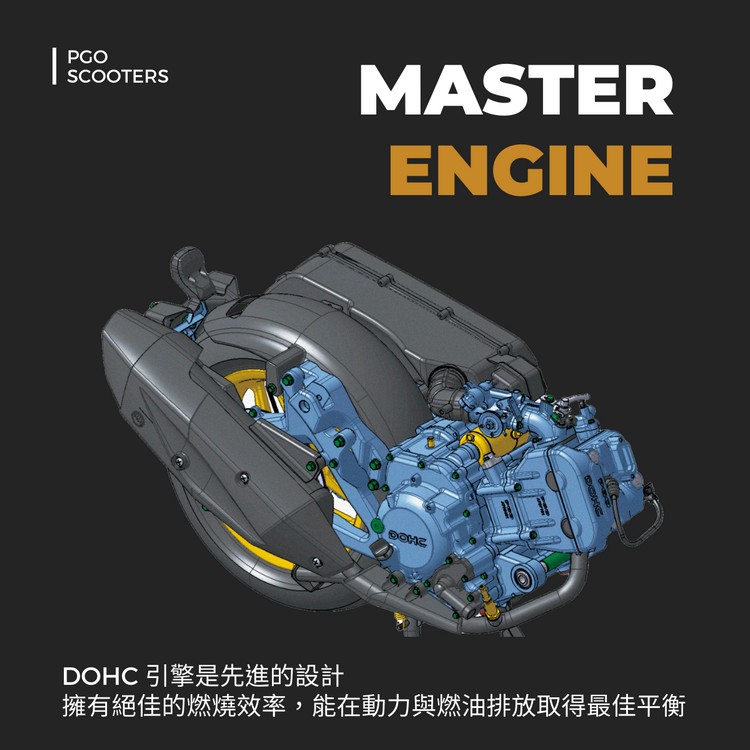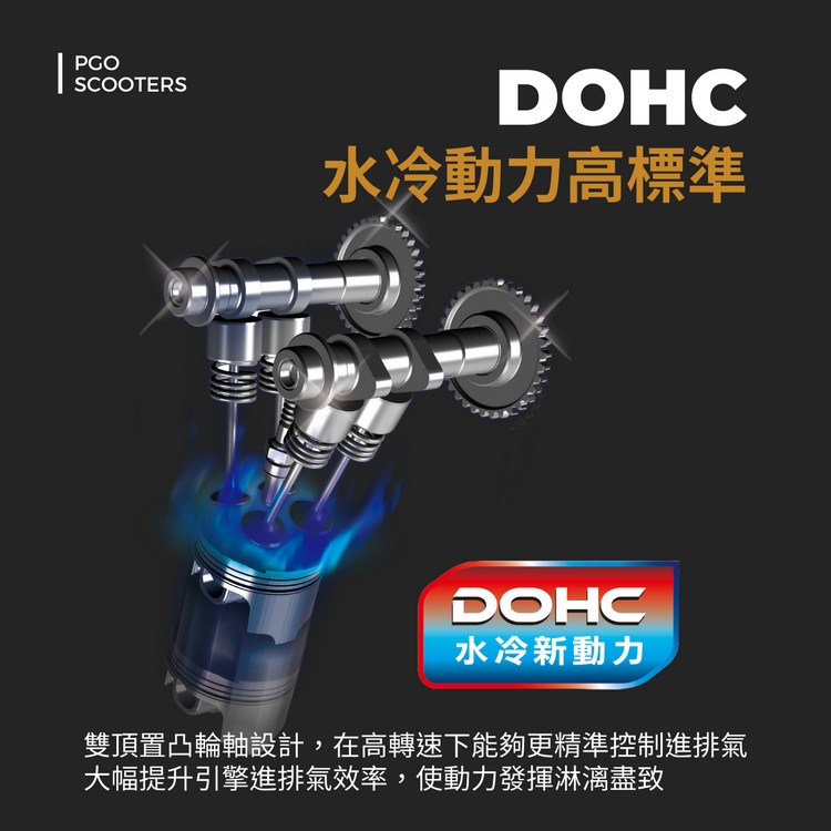 PGO TIGRA 250 黃牌入門車款承襲 PGO 產品一貫的優異性能,搭載全新開發的DOHC水冷新動力,這顆高科技雙凸輪軸最強水冷心臟,極致與完美帶給騎乘者超乎馭想的全新感受,媒體將之譽為“黃牌小鋼炮”。 展現科技巔峰,全新開發251c.c.的PGO MASTER引擎,搭載高性能DOHC (Double overhead camshafts) 雙頂置凸輪軸系統,設計上採用兩顆獨立的凸輪軸,在高轉速運作時能精準地控制與提升引擎進排氣效率,搭配曲軸平衡軸,以減緩引擎所產生的震動;而結構強、輕量化的鋁合金鍛造活塞,將使引擎效能發揮得淋漓盡致,實現了最大馬力 25.5PS/8000rpm、最大扭力 24.5N-m/6750rpm 的傑出表現。