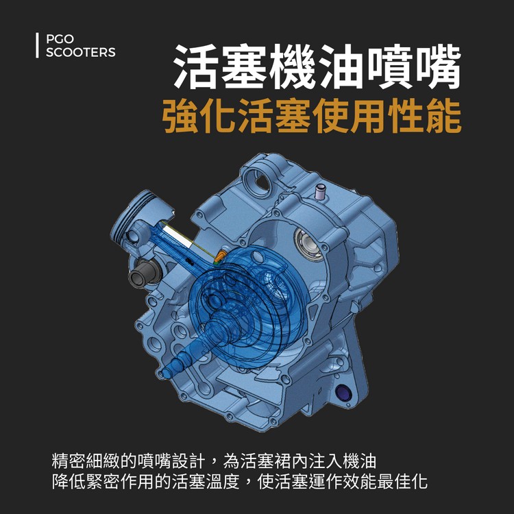 精小細緻的噴嘴設計為活塞裙內部注入機油,目的是為降低緊密作用的活塞溫度,避免內部溫度過高間接影響引擎的運作效能,以加強活塞的使用性能。