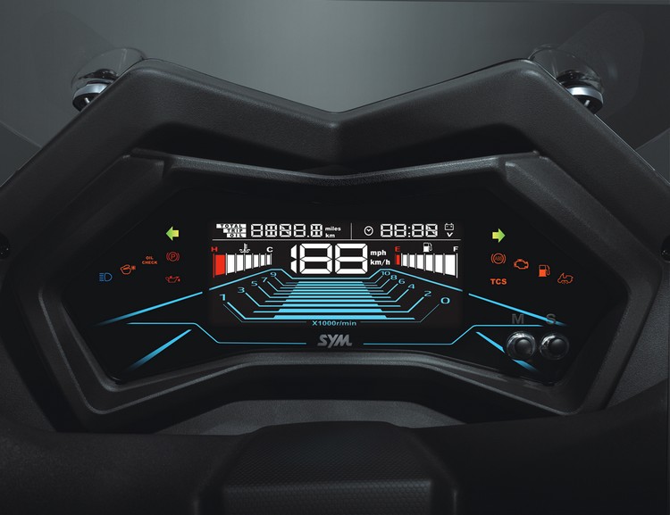 MXSYM GT整體視覺以幾何形狀語彙進行設計,以更為俐落直觀的視覺感受來呈現。頭燈升級為雙魚眼LED頭燈,整體照明亮度相較前款提升118%,提升夜間行駛時的路照辨識,儀錶板搭載新款6吋LCD儀表板,陣列延伸的儀表視覺設計,質感提升的同時,行車資訊辨識也更為直覺,搭配型格三角排氣管及線性俐落的LED導光條尾燈,展現從頭至尾俐落幾何的設計語彙。