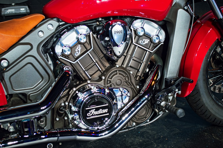 2015年全新Indian Scout是Indian旗下最嬌小的車款,25.3英寸的座高、61.5英寸的軸距和5.3英寸的離地間隙、31度傾角和低重心的設計,提供了卓越的高低速機動性。首度搭載69立方吋排氣量的V型雙缸水冷引擎,約為1131c.c.每缸為DOHC/4閥門發動機,EFI與60mm的節氣門體,轉速限制9000 rpm、最大馬力在於8,100rpm,在水冷系統的加持下,效能大幅躍進,最大馬力可達100HP,峰值扭力則為10.0kgm/5900rpm可提供72.2lb-ft的扭矩。搭配濕式離合器與6檔變速箱,可堪稱同等級車中馬力最強大,速度最快,提供騎乘者高度的操控性以提升駕馭時的樂趣。
