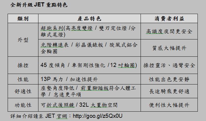 全新JET推出紅/黑、藍/黑、灰/黑、白/銀,共4款車色,搶攻暑假購車旺季! 上市期間更推出全額20期零利率優惠活動,預期將成為年輕世代中的流行機種,同時也是今年度三陽佔有率持續向上爬升的最大動力!