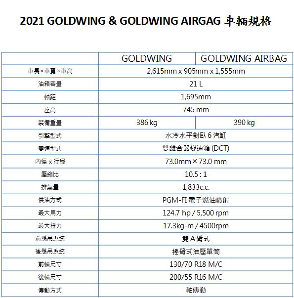 Honda Taiwan於2021年2月1日正式發布2021新世代GOLDWING登場,並從即日至2021年3月31日啟動GOLDWING車系 「尊爵榮耀 全新登場」活動,依車款規格不同,導入GOLDWIND、GOLDWING AIRBAG預接單價分別為119.8萬、128.8萬,車色部分GOLDWING為珍珠炫光白、GOLDWING AIRBAG則為珍珠炫光白與糖果熾熱紅,並採多退少不補為原則接單!預計2021年第二季正式到港交車。