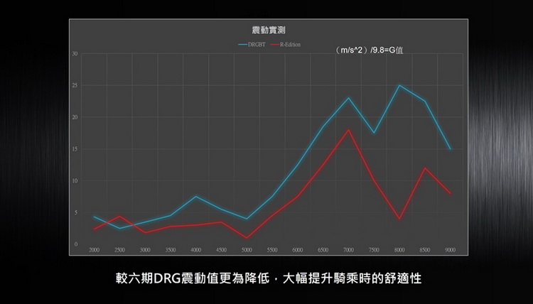 DRG BT「R-Edition」在動力性能上再次獲得提升,同時也符合國家七期環保法規,更獲得能源效率「一級」認證,油耗達到39.9km/L的最佳表現。 「騎乘感受更舒適」 本次改款亦透過引擎內部組件降低摩擦係數、減少引擎共振等方式,大幅減少DRGBT在騎乘時的震動,有效提升騎乘時的舒適度。