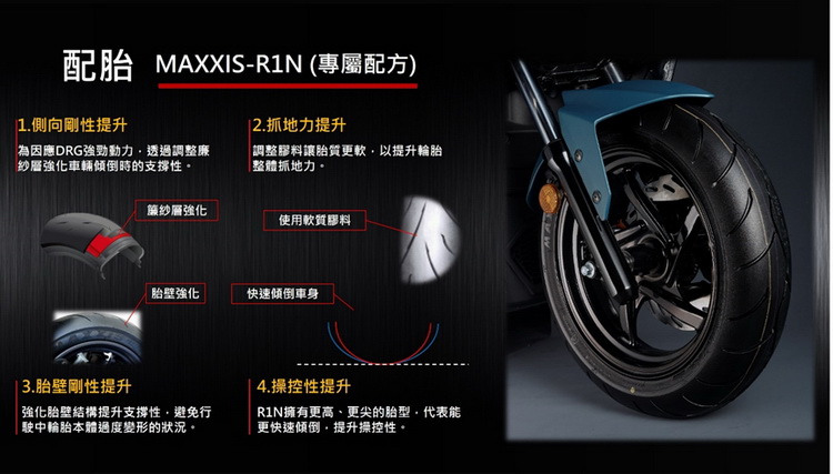 本次和國際知名大廠MAXXIS瑪吉斯輪胎共同合作開發DRG BT專用的MAXXIS-R1N,源自性能胎款R1的賽道基因,配合DRGBT的特性並針對道路使用調整配方,提供更好的操控性能。