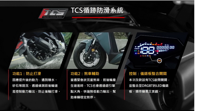 為因應提升過後的強勁動力,本次改款也搭載TCS(Traction Control System),除了避免惡劣路況所造成的打滑以外,也能在緊急重剎車產生前後輪速差時,TCS也會透過退引擎點火角的方式輔助減速,讓騎士更安穩的剎停。