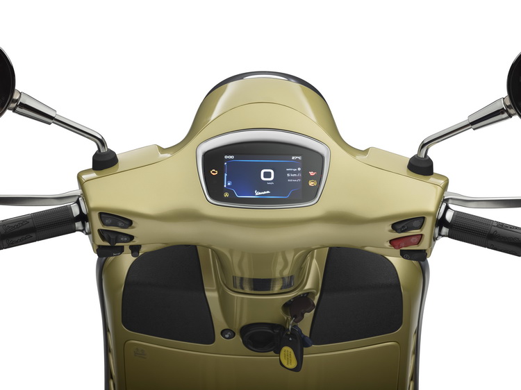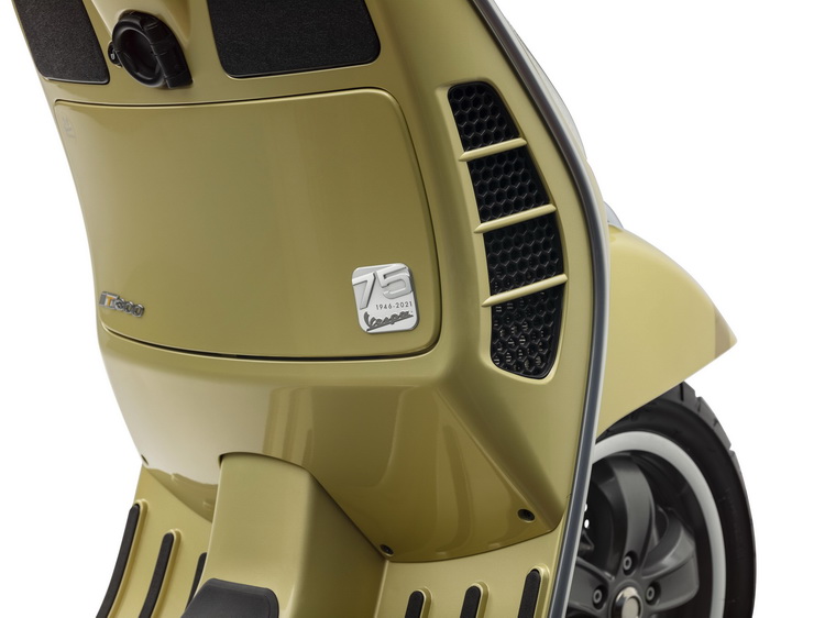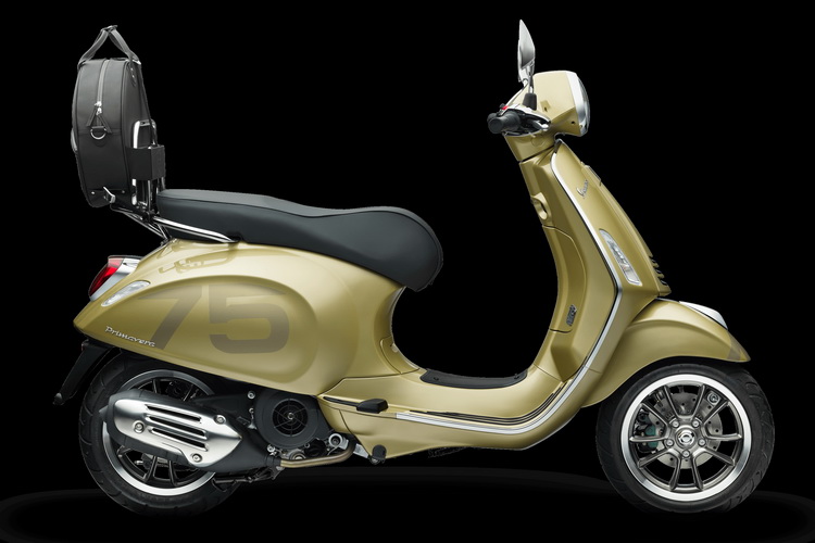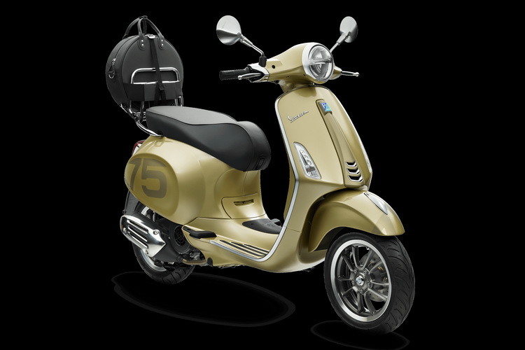 ![]() Vespa 75週年特仕版承襲Vespa的傳統,採用鋼製單體式車架,並選用「琉璃金」自然金屬色澤,作為對1940年代流行色調的現代詮釋,呼應Vespa完美融合傳統、創新、與時尚的風格。除此之外,Vespa 75週年特仕版使用同色系但較深的陰影色調進行細節點綴,包含車頭造型領結飾蓋以及在前土除和車側兩旁的數字「75」,營造其低調奢華的風格。