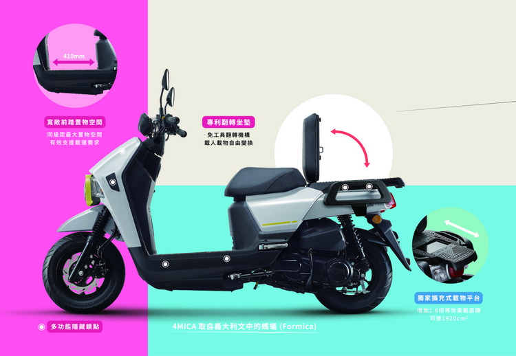 「獨家擴充式載物平台」,4MICA本次最大的亮點,是在後方的載物平台上新增了抽拉式空間擴充的功能,操作時完全不需要工具,展開時最大面積可增加1.6倍空間,另外考量到消費者的載重需求,透過強化載物平台的結構讓最大載重達到40kg,讓4MICA的載物功能最大化。 「專利翻轉後座墊」,SYM獨家專利機構導入,只需一手輕拉翻起即可變換載物模式/載人模式,如需要更大的載物空間,也可將後座墊拆除使用。 「多功能隱藏鎖點」,考量到日後車主加裝配件、支架等需求,4MICA提供12個擴充鎖點,並且隱藏在車殼、飾蓋、扶手等位置,避免鎖點外露讓4MICA的外觀保持簡潔、俐落。 舒適便利更安心 「後輪手煞車」,針對台灣複雜的地形及路面狀況,4MICA於後煞車總成配備手煞車功能,停車後一手抓握即可鎖定後輪煞車,再騎乘時輕拉煞車拉桿即可快速解除,在提升安全性的同時,也能提升便利性。 「人因工程設計」,為提升4MICA日常通勤使用的舒適性、便利性,前後座墊以高密度泡棉加厚處理,減緩長時間騎乘的不適感,且透過前把手後移、74.7cm最低座高的設計,讓男女老少都能輕鬆騎乘。 「寬敞置腳空間」,4MICA為確保騎乘者的舒適性及額外的載物空間,前置腳空間達到同級距最大410mm,且在內裝件做防滑表面咬花處理,提升放置物品時的安全性。
