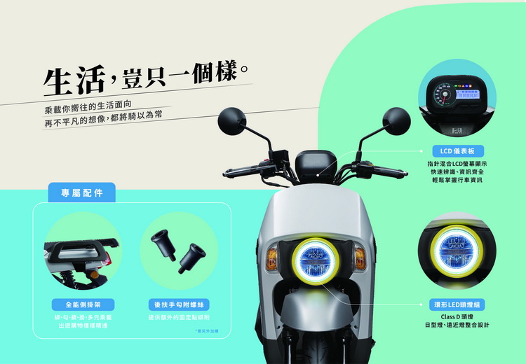 「環形LED頭燈組」,4MICA導入Class D 汽車級LED頭燈,採用日行燈、遠近燈整合設計,創造更簡約的視覺效果,LED高照明度的特性,也確保長途、夜間騎乘的安全性。 「LCD儀錶板」,全新設計的LCD儀錶板,除了有極佳的辨識度,豐富的行車資訊整合至小巧的LCD螢幕,巧妙的融合至4MICA的車身線條設計。 全能擴充套件組(需另外加購) 「全能側掛架」,針對綁、勾、鎖、掛多種常見的固定方式為設計理念,讓車主也能有效利用車身兩旁的空間,且採用複合材質強化載重能力。外型也配合4MICA的車身線條設計,讓全能側支架既美觀又實用。 「後扶手勾附螺絲」,提供車主額外的繩索固定施力點,確保騎乘中不因震動而導致鬆脫,避免造成物品掉落的危險。