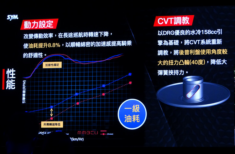 性能方面,透過CVT傳動設定的調整,讓MMBCU保有充足加速性能的同時,降低各速域的巡航轉速,提生騎乘時的靜肅性及續航力,並且符合能源效率一級油耗的認證。