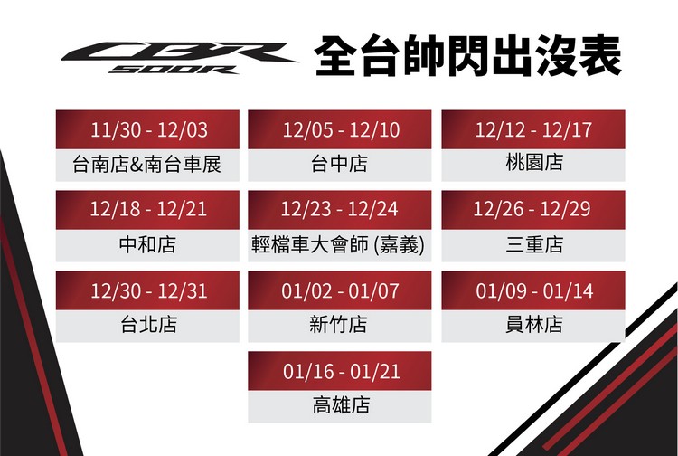 HONDA人氣街跑車CBR500R一直扮演著CBR FIREBLADE的起點,擁有輕量化的車身、優異的操控性以及易入手的價格等優點,引進台灣市場以來,累計銷售台數已突破2500台,為了滿足所有顧客們對於產品線的期盼,Honda Taiwan於今日導入全新2024年式CBR500R,並將在2023年12月2號、3號南臺科大汽機車大展首次亮相,歡迎所有熱愛二輪生活的顧客至Honda Booth 一同見證全新2024年式CBR500R融合FIREBLADE DNA,更加熱血的運動基因。