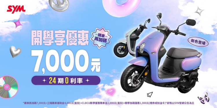開學季不只推出新色讓大家有更多選擇,還推出限定優惠活動,CLBCU開學享優惠,購車不只給妳好看又便利的騎乘體驗,再加碼享優惠7,000元(=三陽購車補助金 4,000 元(直扣)+CLBCU 開學優惠購車金 2,000 元(直扣)+開學加碼優惠 1,000 元(禮券或加油卡)),還有24期分期0利率(現金分期同價)。