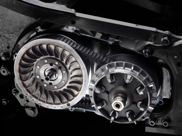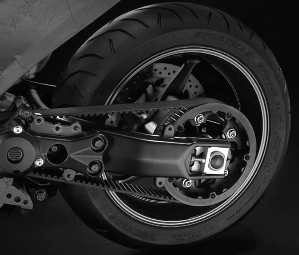 三代TMAX另一個改造的重點是過去的雙鍊條傳動改成齒盤式皮帶傳動。好處在於結構簡單、重量變輕以及傳遞效果更為直接。雖然看到前面一大串說明好像新的TMAX會有迥然不同的變動一樣,但事實上這樣的改變更貼切的說法是這代TMAX所呈現的是一種更為成熟的進化。
