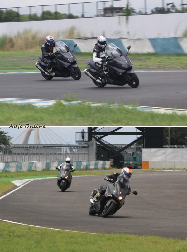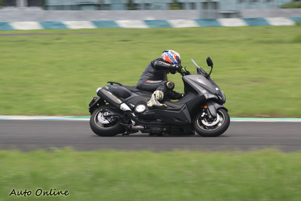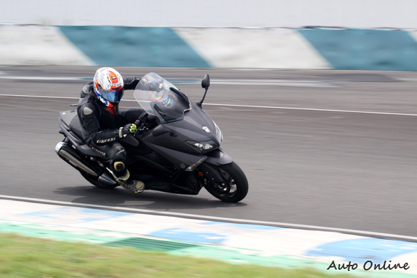在賽道試車的經驗不算少,但騎乘大型Scooter在這裡試車倒是第一次。因此第一圈的的時候我們主要以孰悉場地為主,並不刻意追求極限。在頭圈中低速的暖胎時,我們感受到TMAX在中低速域的輸出相當平穩滑順,檔位間的接合流暢。而當我們逐漸熟悉車輛的特性後,加大的油門讓我們見識到TMAX不同風情的另一面。