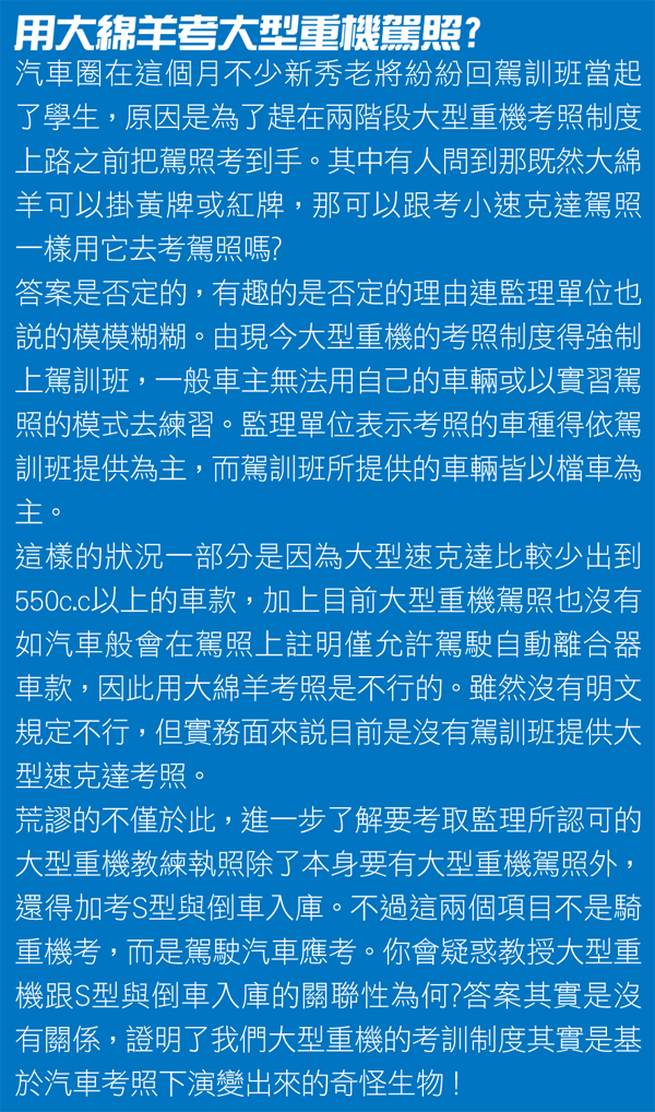 隨著黃牌路權的開放,黃紅牌重機在台灣有越來越蓬勃的趨勢。各車廠也紛紛推出相對應的產品,也都傳出不錯的銷售佳績。台灣出產的速克達在國際如同我們的自行車一樣可都是響噹噹的大牌子,而過去以外銷為主國產大綿羊現在終於可以在台灣找到舞台,讓台灣車迷有更多的選擇。