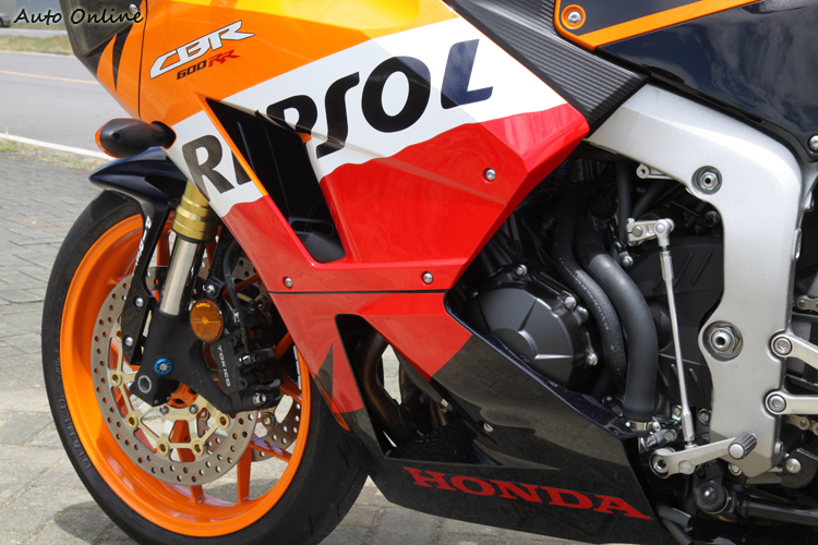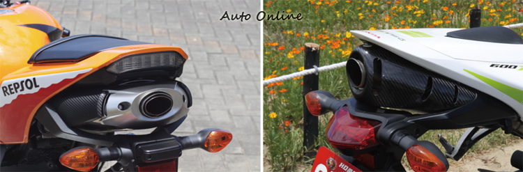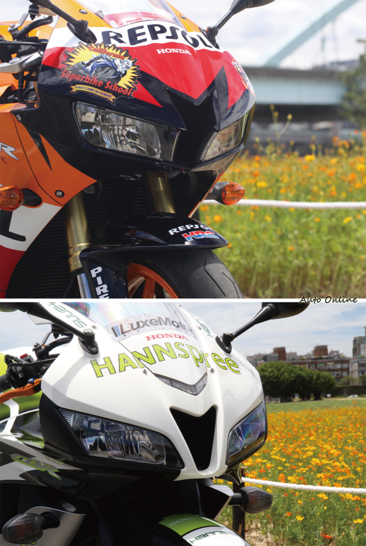 乍看到兩台車時直覺以為兩台車應該都是大改過的車,因為車上滿是花花綠綠的貼紙,有如賽車一般。事實上CBR600RR除了如紅、黑等素色版之外也會針對重大比賽成就推出特別塗裝版。13年的CBR600RR就是所謂的GP廠車式樣,因此車身上就會彩繪上冠名贊助機油商Repsol的字樣。