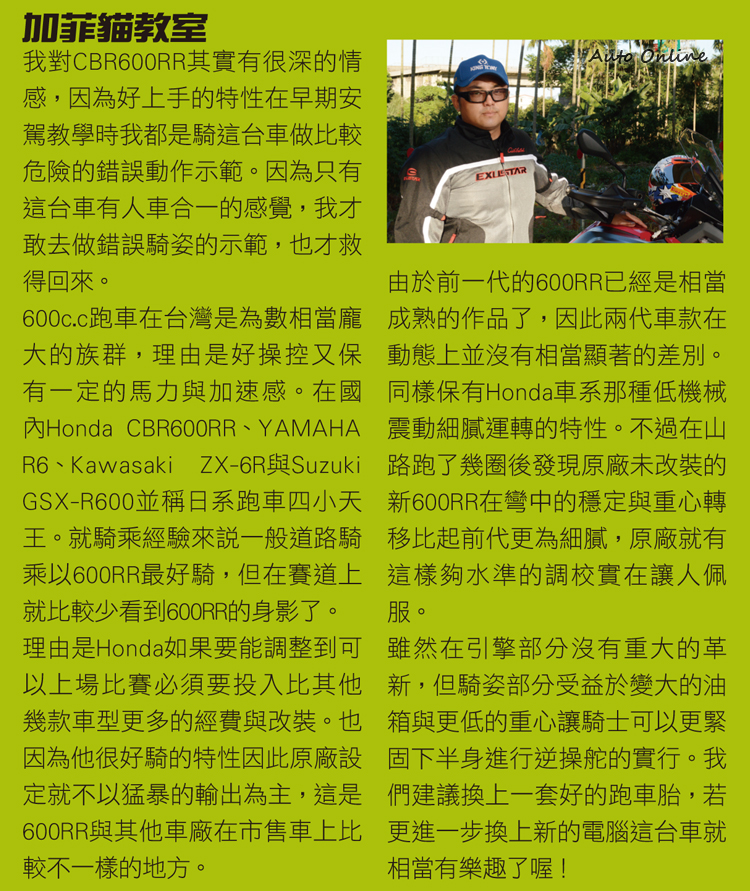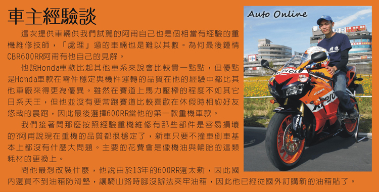 對於很多重機騎士其實而言,CBR600RR可能是很多人剛入跑車原地時的第一台車款。穩定、好上手又保有一定的運動性格讓CBR600RR成為Honda重車中在台灣賣得最好的一款。這次承蒙兩位車主的幫忙,讓我們有機會完成這樣對照的試車報導。13年的600RR甚至里程數還不到500km,而HANNspree版也在車主的細心照料下依舊勇健,在此再跟兩位車主說聲謝謝。