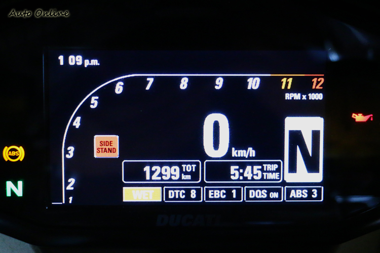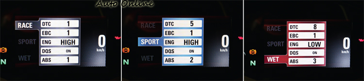 ▲下方字樣意思分別為DTC(Ducati Traction Control)、EBC(Engine Brake Control)、DQS(Ducati Quick Shift),後方數字則為介入等級。